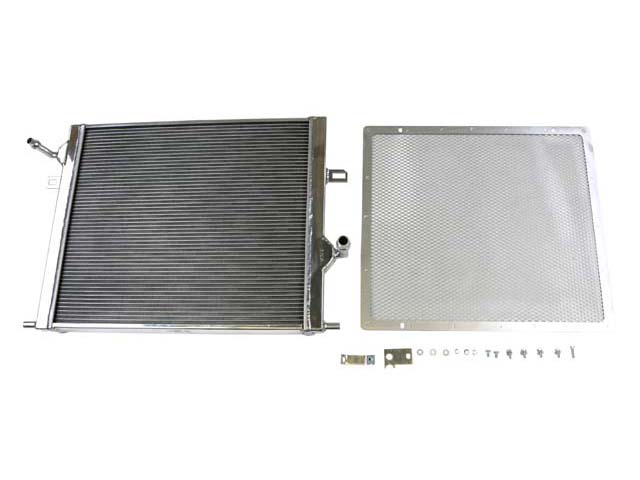Notes: 2-row 68 mm core (dual core) featuring B-tube technology. Triple pass design. Core features an ultra-efficient fin with 6.5 mm fin height and multi-louvered design for maximum surface area contact. CNC machined quick-connect inlet/outlet connections and all aux connections. CNC machined brackets and fittings for superb fit and durability. Includes rock guard.