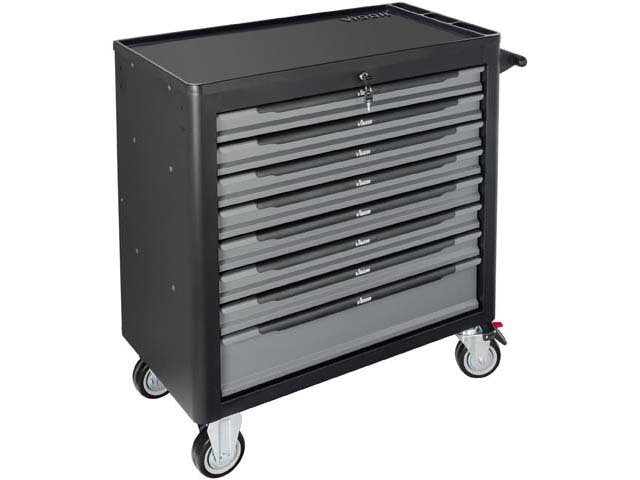Stainless steel worktop with a powder-coated body and small parts shelf made of sturdy plastic. 2 swivel castors with double stop locks, 2 fixed castors. 55 lb load capacity per drawer. 7 short and 1 tall drawers.